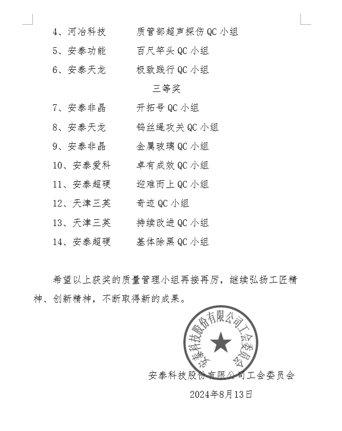 為鼓勵員工參與質量提升及改善活動,提高質量意識和創新能力,持續進行質量改善、降低消耗、提高工作效率,河冶科技-質管部超聲探傷QC小組榮獲中央企業、北京市優秀質量管理小組三等獎, 2023年安泰科技第十一屆優秀質量管理小組二等獎。